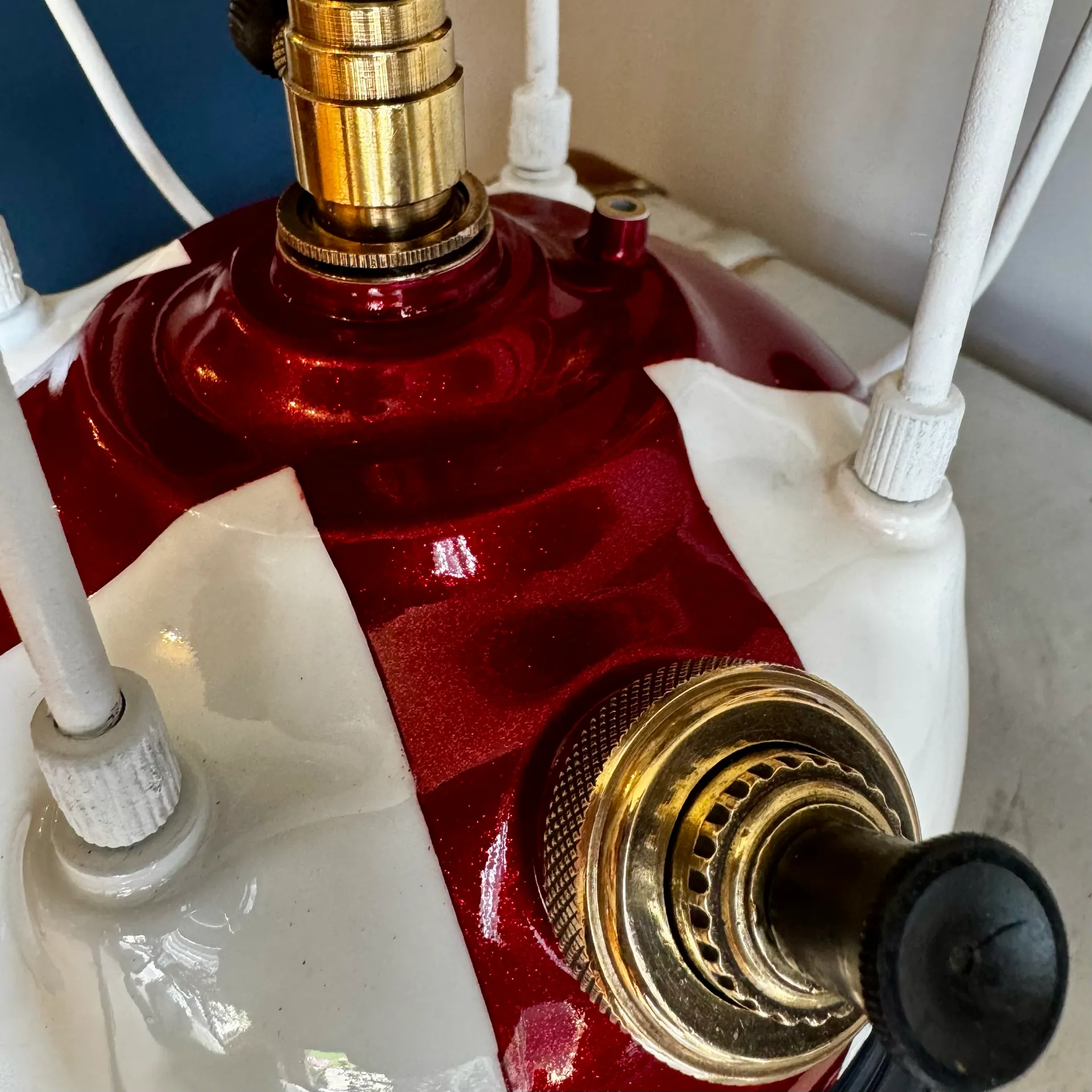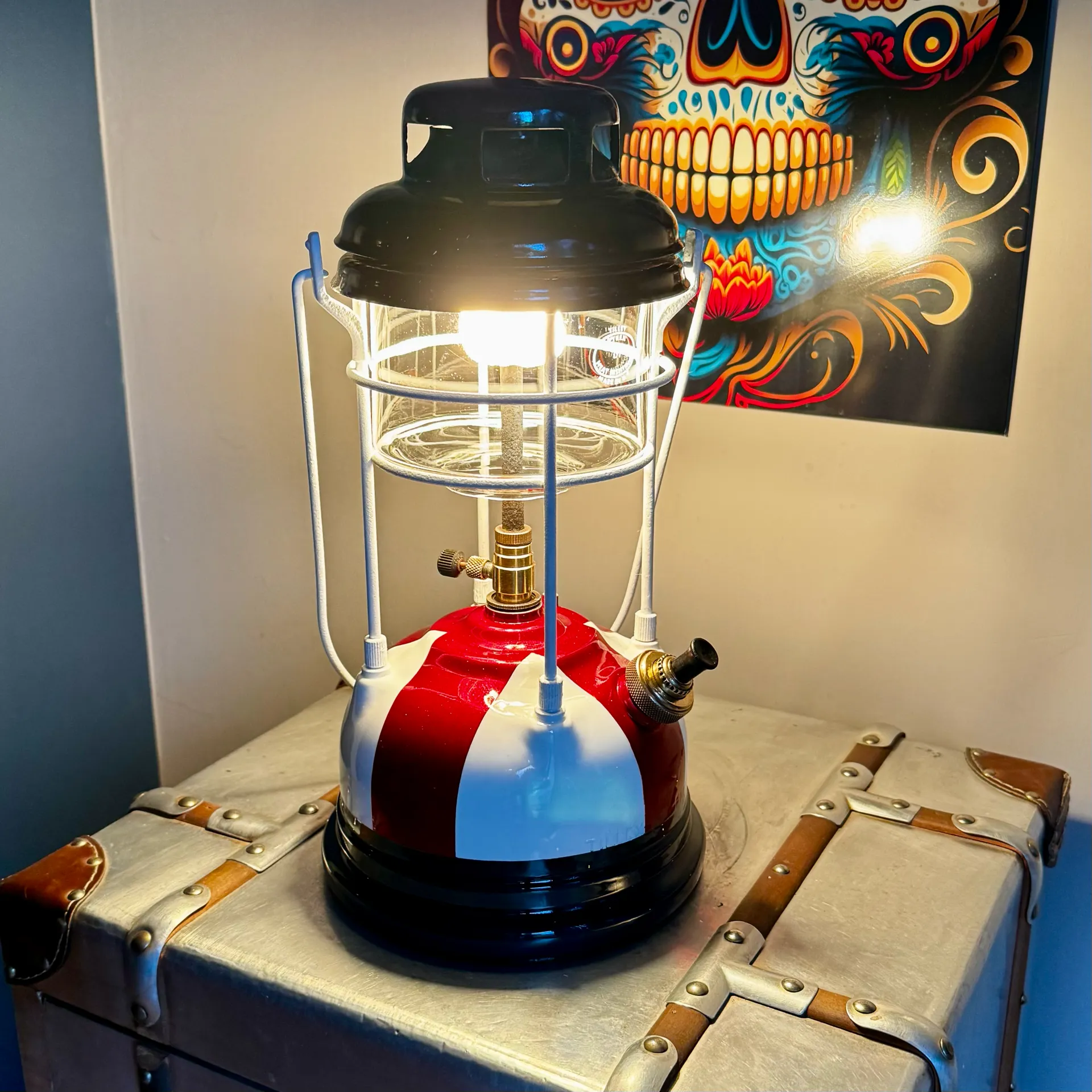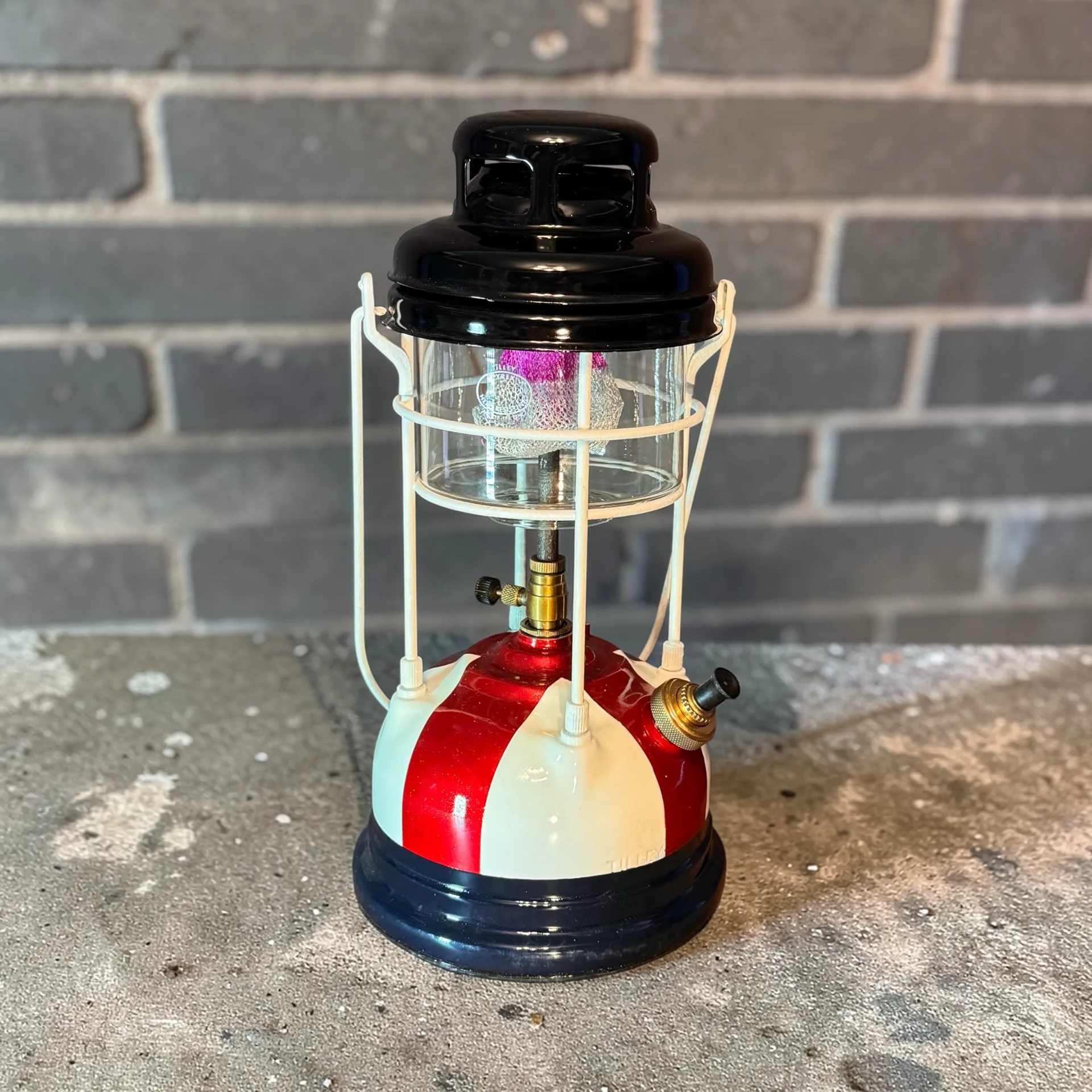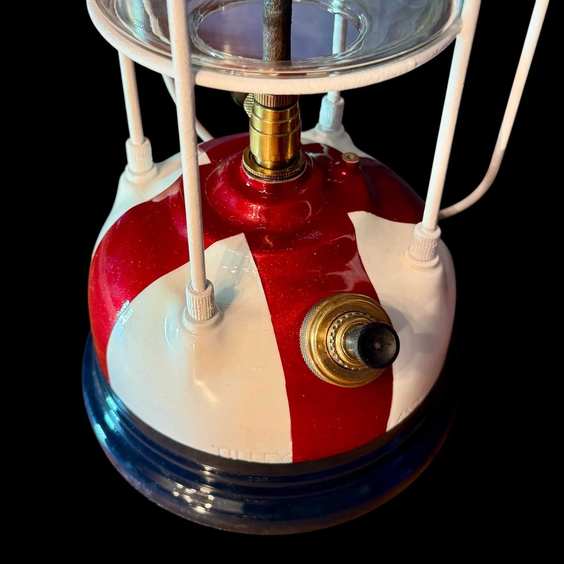 Bring a touch of the 1950s into your home or collection. This original Tilley Guardsman lantern features the robust build quality the brand is famous for, updated with a unique St. George’s Cross paint scheme. The deep red cross is infused with a fine sparkle, providing a brilliant depth to the finish.